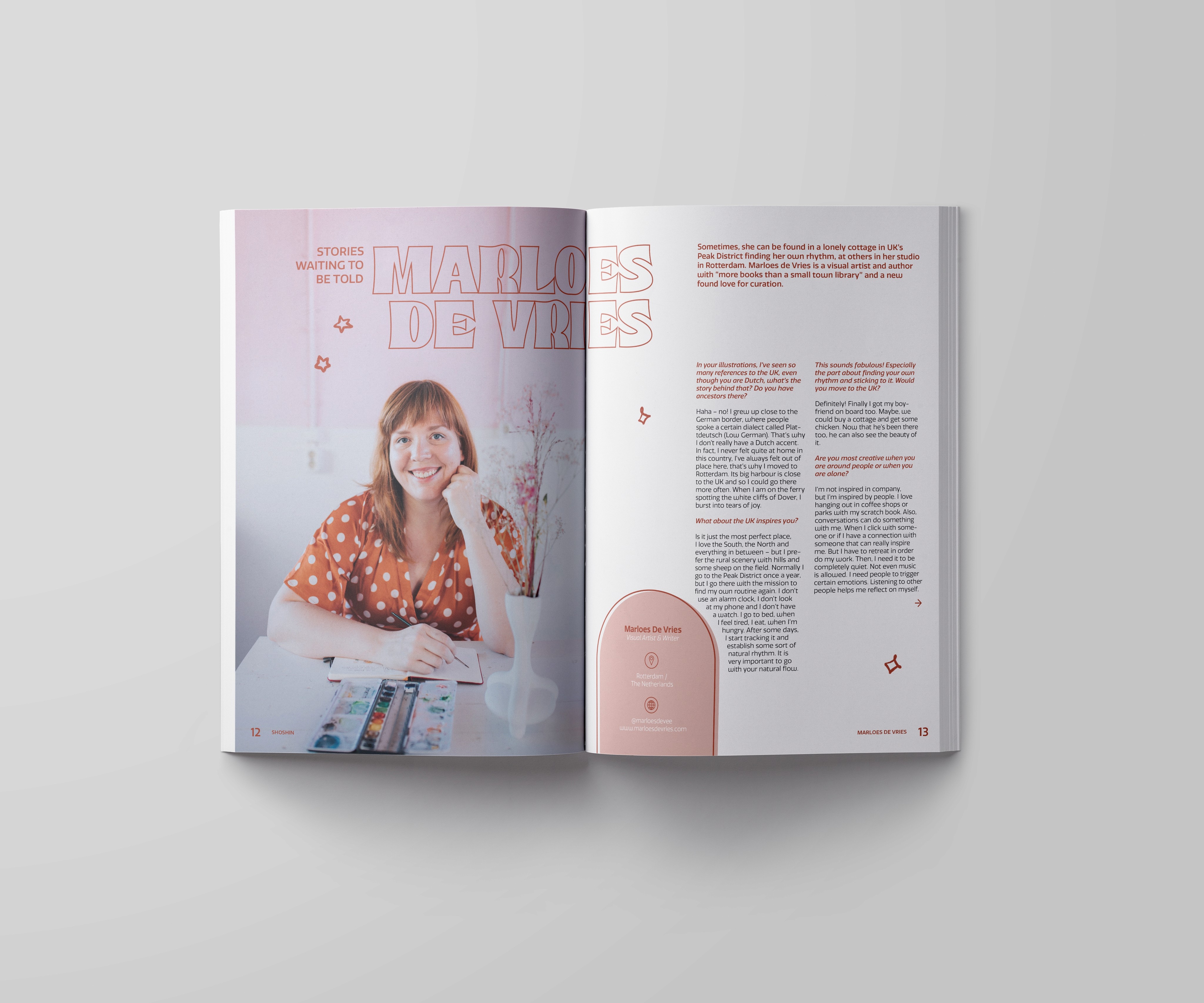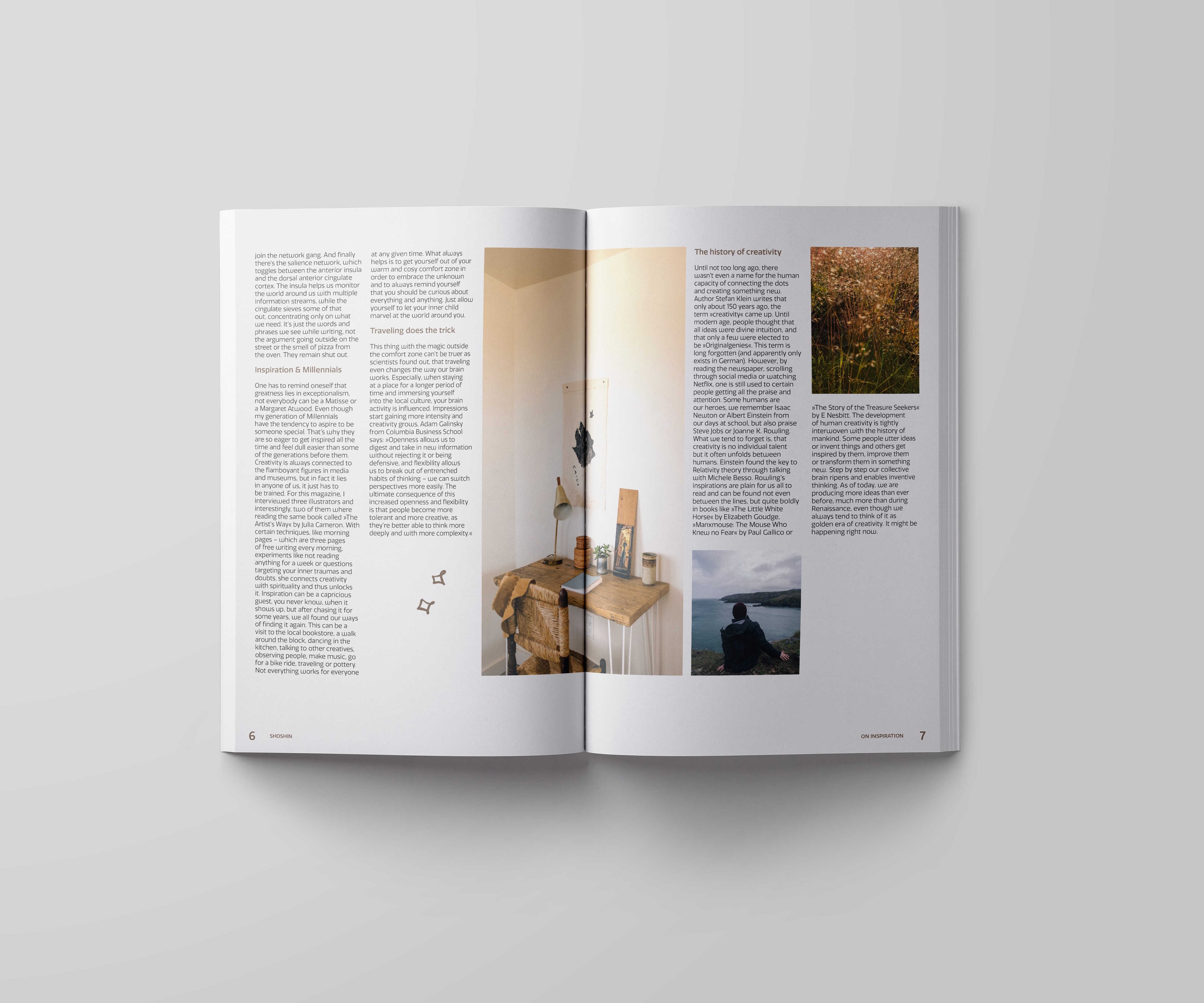 Shoshin ist ein Magazin zum Thema Inspiration, herausgegeben von Katharina Zimmermann. Im Rahmen ihres Unterrichts durften wir im Studium das Magazin in Gruppen von zwei Personen für eine spezielle Zielgruppe neu gestalten. Die Zielgruppe bestand aus „Öko Influencer:innen“. Das bedeutet, wir haben uns auf eine nachhaltige Produktion mit Recyclingpapier konzentriert und versucht, die Zielgruppe im Layout mit Farben und Bildauswahl anzusprechen. Das Layout der Seiten war Teamarbeit.